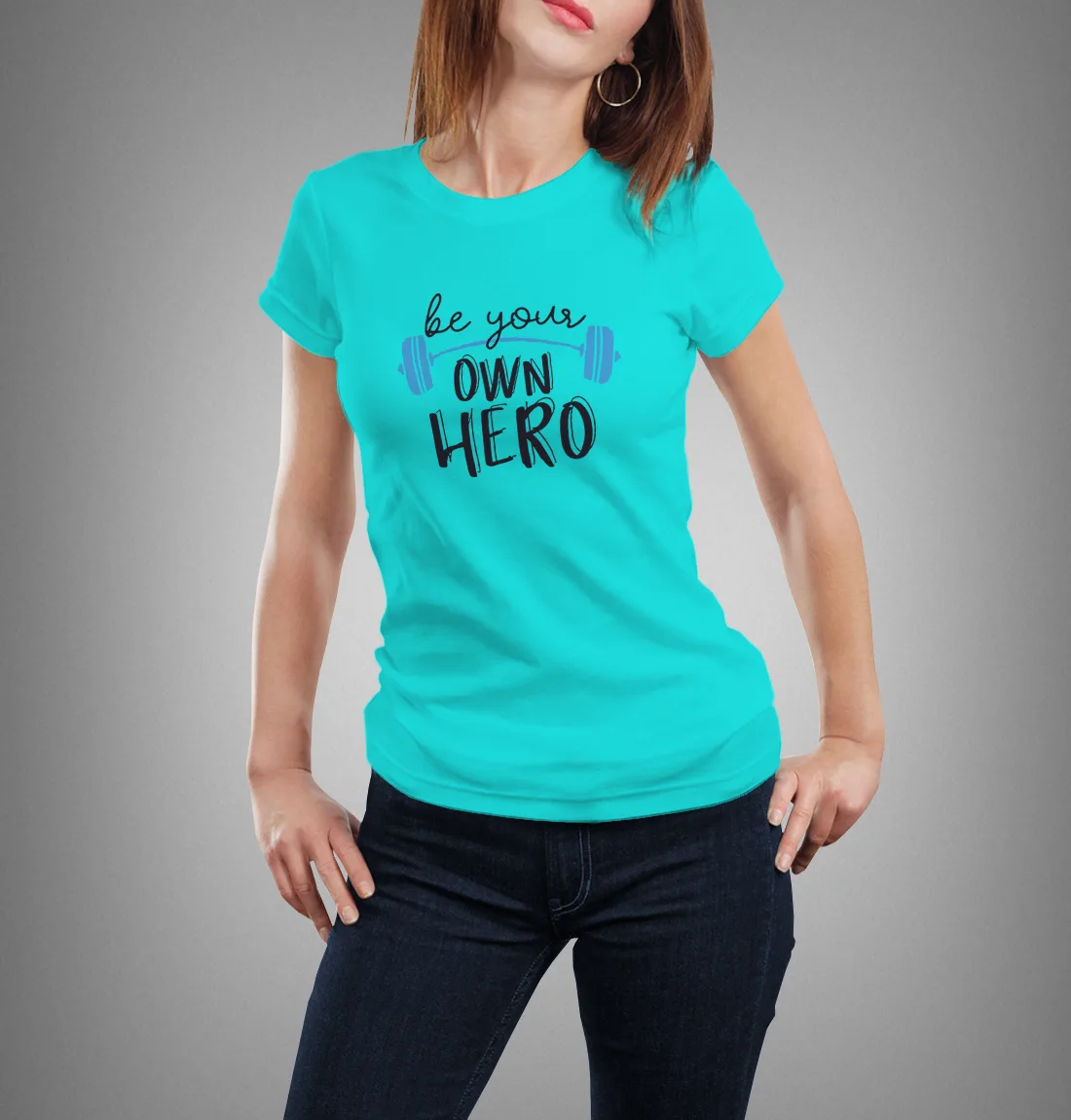 Camiseta femenina Be Your Own Hero en color cian, con un diseño moderno y motivador. Una prenda cómoda y versátil ideal para un estilo casual con actitud.